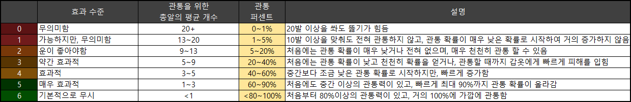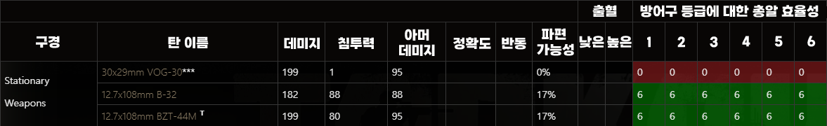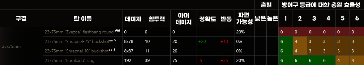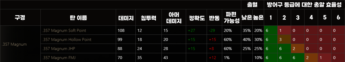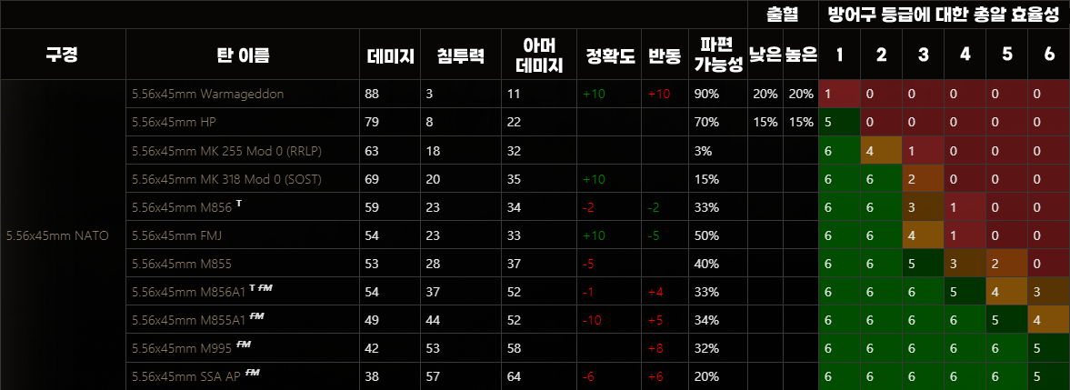 안녕하세요! 타르코프 23년 최신 총알표 정리 글입니다! 먼저 총알 표를 읽는 방법에 대해서 알려드리도록 하겠습니다. ■ 총알표 설명 - 가장 왼쪽의 0~6까지의 번호가 높으면 높을수록 좋습니다