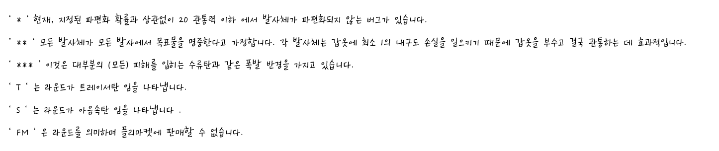 - 탄 이름 끝부분에 있는 표시는, 아래를 참고해주시면 감사하겠습니다.
